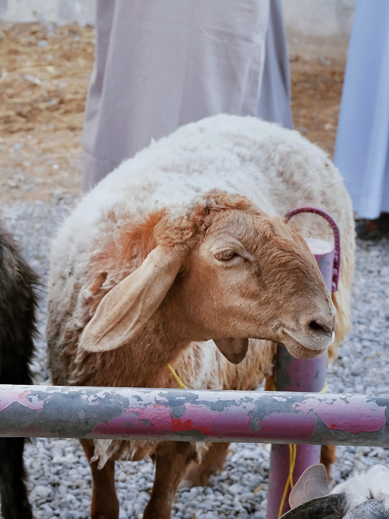 This morning, too, countless men are negotiating with each other in a respectful and focused manner. Unimpressed by the tourists crowding around the trading circle, they go about their business as usual. Following tradition, this is a business for men, all of whom are dressed in ankle-length robes (Dishdasha), combined with either a cap (Kumma) or a headscarf. With determination but without haste, the traders bring their “wares” into the circle, parade them around once and then return to their places on the outer edge, where they are examined closely. Pony-sized sheep nervously pace up and down, silky spotted goats wriggle on their posts and calm-looking oxen lie on the barren ground. Here, offers are negotiated, decisions made and sealed with a handshake. We are impressed by this timeless exchange: no shouting, no pushing, no rushing.