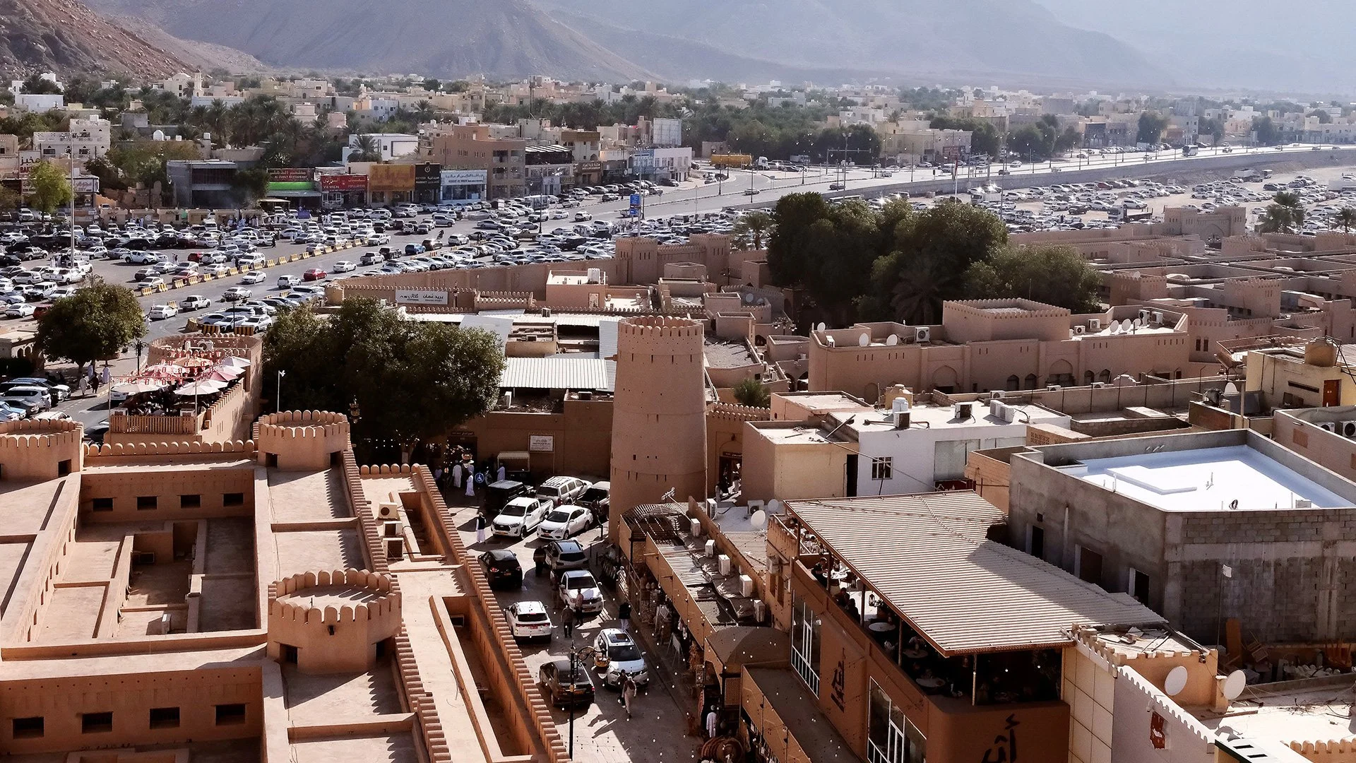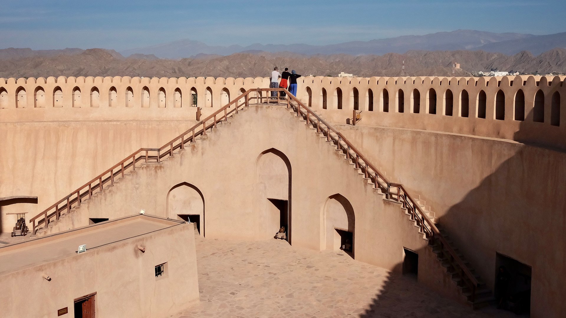 Still buzzing from the lively hustle and bustle of the market, we make our way to Nizwa Fort. In the morning light, it stands tall and proud at the edge of the city wall. We decide to take advantage of the calm at this time of day to explore the history of the fort and its significance for Nizwa. Construction began in 1658 under Imam Sultan bin Saif Al Ya'arubi during a period of political consolidation, when Oman secured its independence and repelled external powers. The fortress was less a residence and more a stone manifestation of authority, protection and foresight. Its mighty round tower measures about 45 metres in diameter and rises about 34 metres high. Its size was strategically designed: space for cannons, supplies and defenders, a wide view over the oasis, trade routes and potential dangers. As we climb the spiral staircase, the secrets of the fort are revealed more and more. Massive walls that once absorbed cannonballs, deep drop shafts that forced attackers to be cautious and slow, and seven wells hidden within the complex tell of a time when tactical endurance was a matter of life and death. Even months-long sieges would not have brought everyday life here to a standstill. Once at the top, Nizwa lies open before us. We look out over the market, the alleys, roofs, mosques, palm groves and the peaks of the Hajar Mountains in the background.